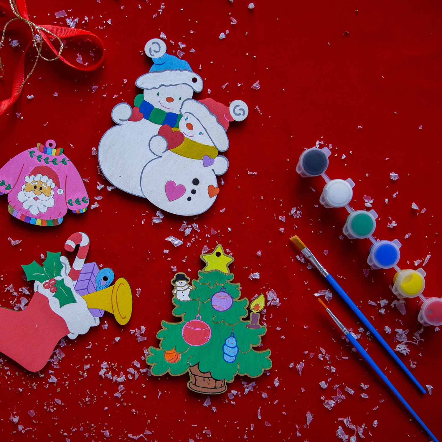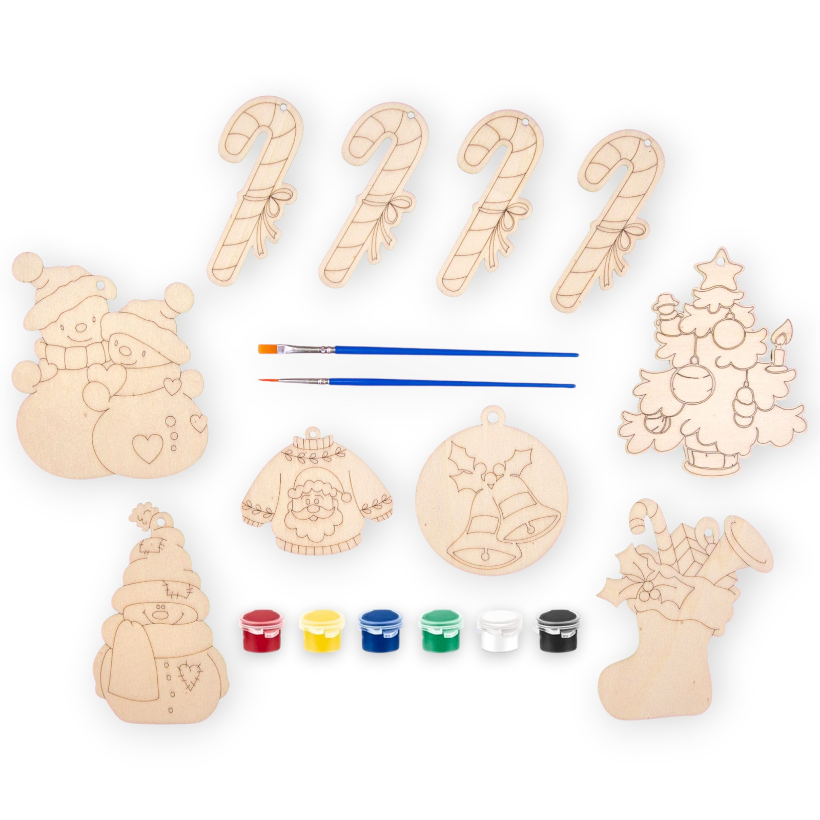 Setul include 10 ornamente cu teme de Crăciun: oameni de zăpadă, bastonașe, brăduț împodobit, puloverul lui Moș Crăciun, glob cu clopoței și o cizmuliță cu cadouri. Modelele sunt variate și potrivite atât pentru pictură simplă, cât și pentru detalii mai fine. Activitatea este relaxantă, practică și oferă rezultate vizibile imediat, ceea ce îi motivează rapid pe copii.
