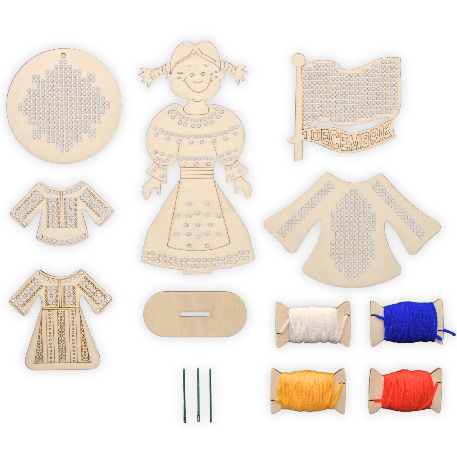 • Piese incluse: steag „1 decembrie”, cerc perforat, personaj băiat/fată (în funcție de varianta selectată), 3 modele de ii (rochie, bluză, ie).