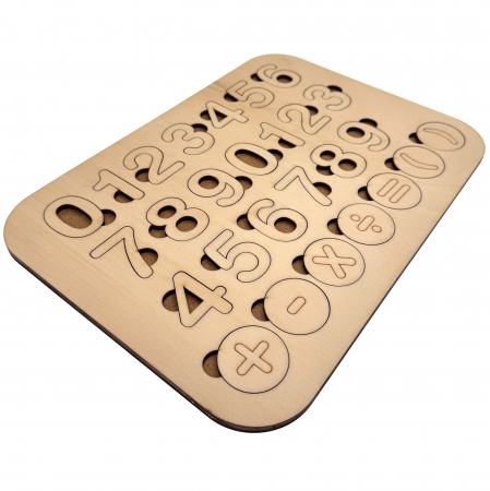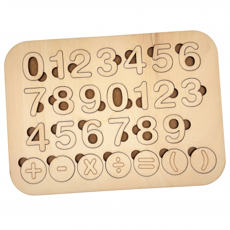 Tabla cu cifre și operații matematice în stil Montessori este un material educațional din lemn, decupat și marcat precis la laser de Lasercraft (Timișoara). Piesele detașabile pentru cifrele 0–9 și semnele aritmetice se scot ușor datorită decupajelor laterale, încurajând motricitatea fină și autonomia copilului. Dimensiune: 21 × 30 cm.